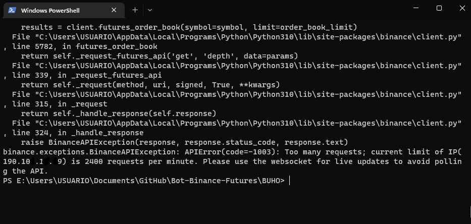 Too many requests; current limit of IP(190.10x.1x.x9) is 2400 requests per minute. Please use the websocket for live updates to avoid polling the API.