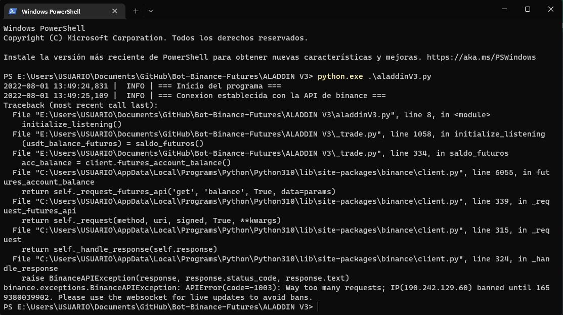 La API de Binance tiene como límite un máximo de 1200 solicitudes por minuto, así que ve despacio.